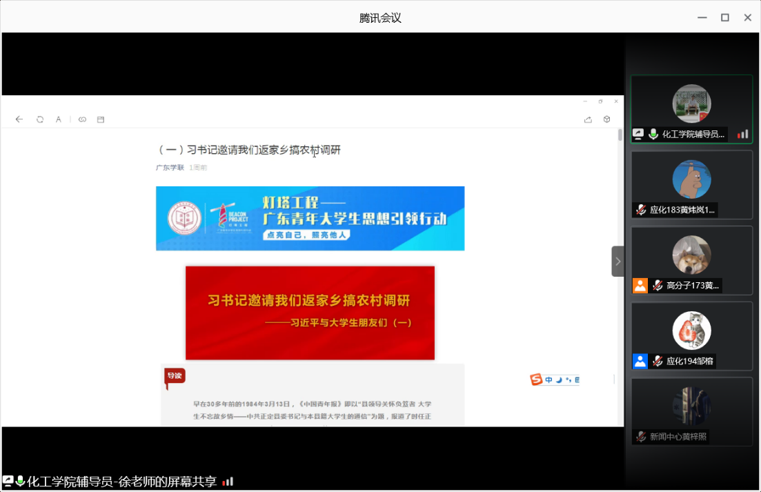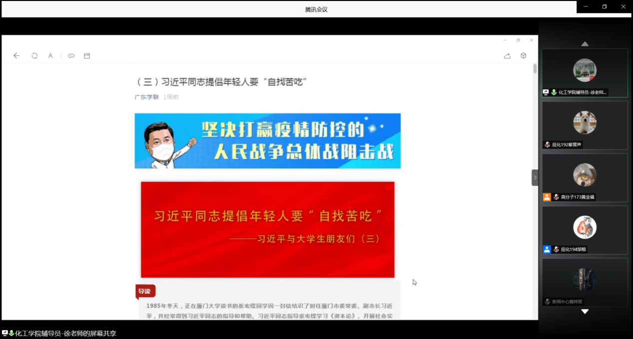 7月6日晚上,为进一步深入贯彻、落实总书记关于青年工作的重要思想,深入实施灯塔工程,坐实、做深青年大学习,BV伟德官方网站于腾讯会议开展学《习近平与大学生朋友们》系列报道专题讨论会。出席本次会议的嘉宾有BV伟德官方网站团委副书记徐冠东、辅导员刘亚宁、三大机构负责人以及各班学生代表。