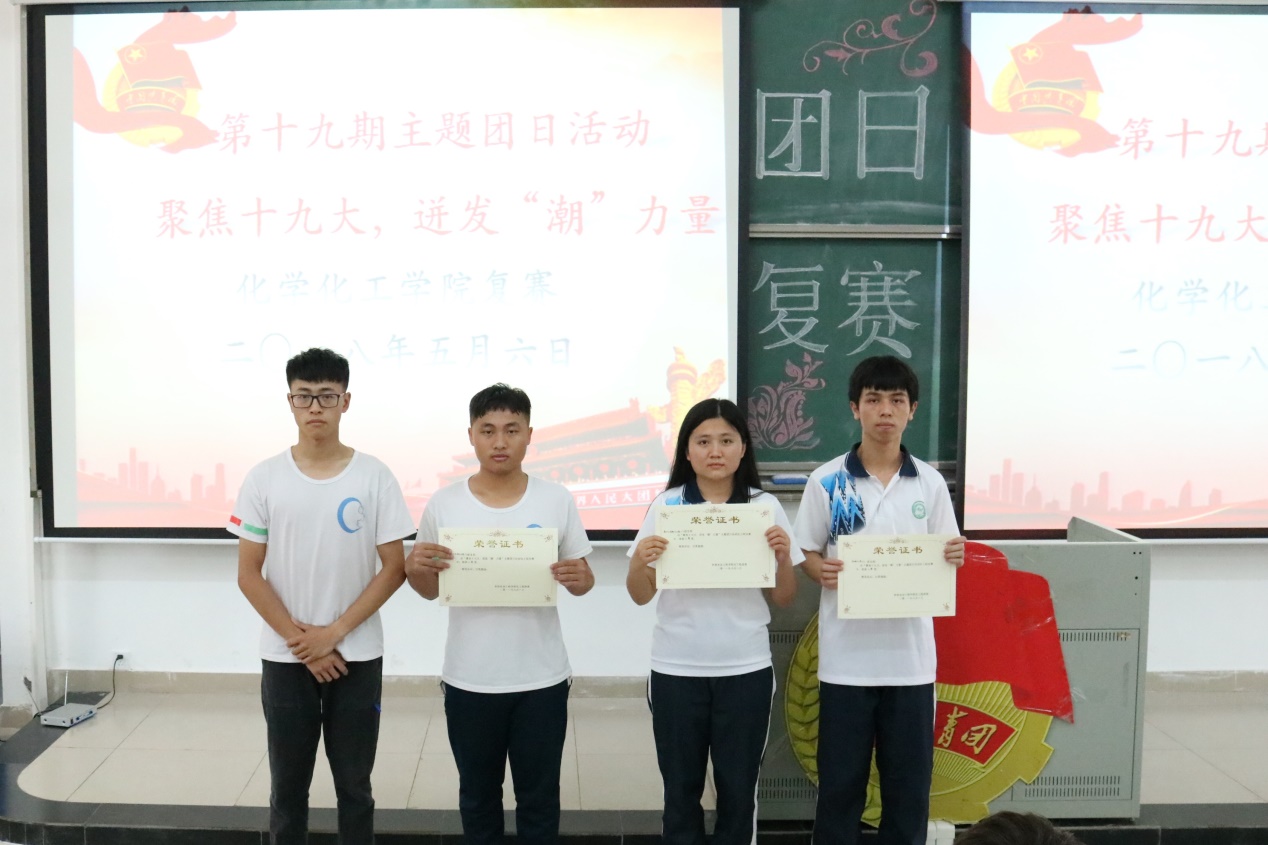 历史新起点,伟大新征程。复赛开始前在座全体师生起立奏唱团歌,接着屏幕播放了各个班的团员心声的视频。每个视频都展现出了优秀团员们有理想,有能力以及有担当的的风采。播放心声视频的环节结束后,比赛正式开始。本次比赛由各班团支部进行PPT演讲、班级表演及班级视频播放,最终评委团会根据各班级的表现进行评分。最先上场的是高分子173,他们以手语表演舞台剧,展示了团支部的风采。随后,应化173、高分子163分别带来深情激昂的朗诵,表现出对未来的浓厚期待与祝福。