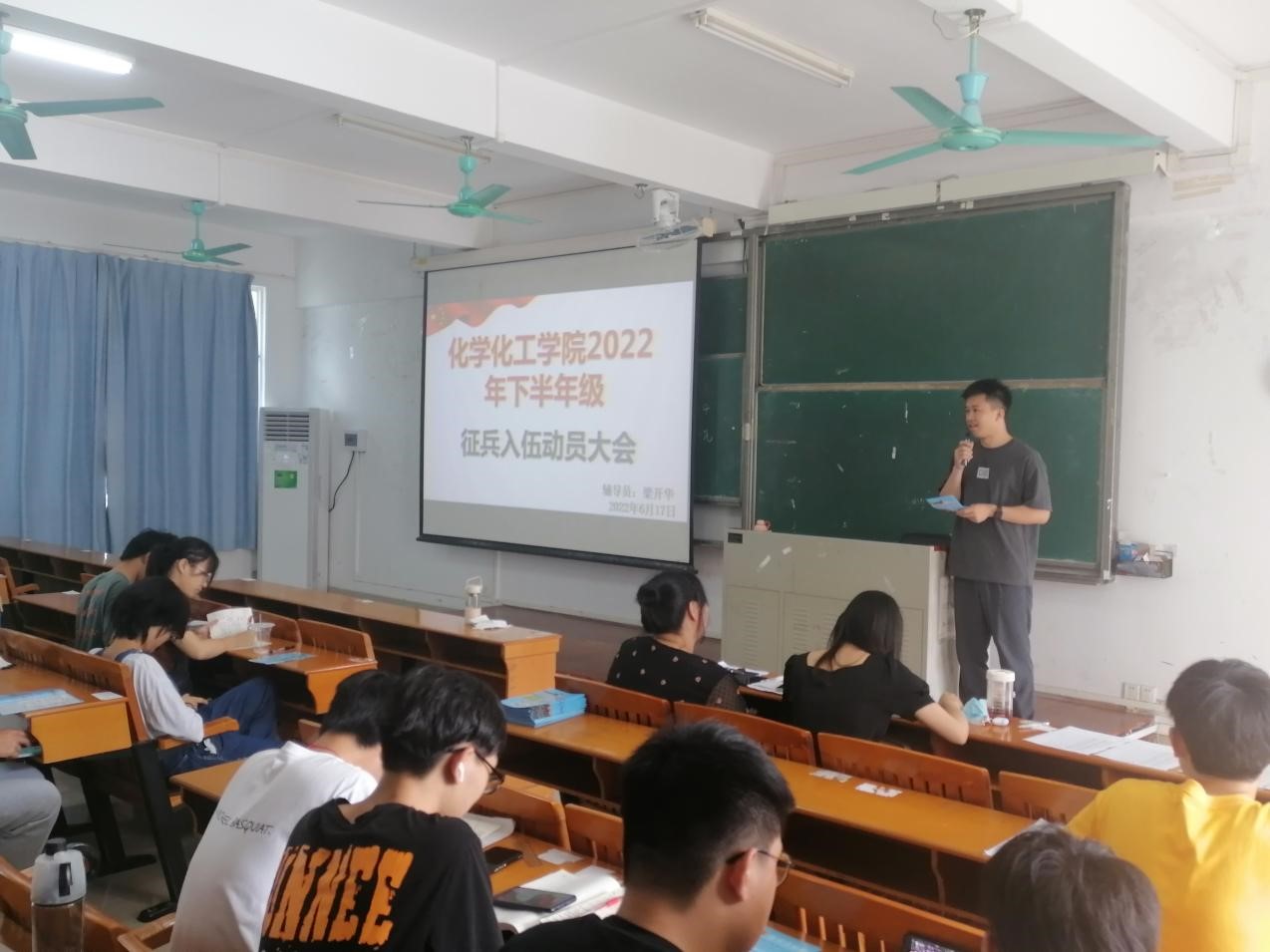 辅导员梁开华在大会上进行征兵宣传,讲述了征兵时间、征兵要求、征兵福利等。梁老师表示希望同学们能积极相应国家号召,带着满腔热血投身于保家卫国的队伍当中。