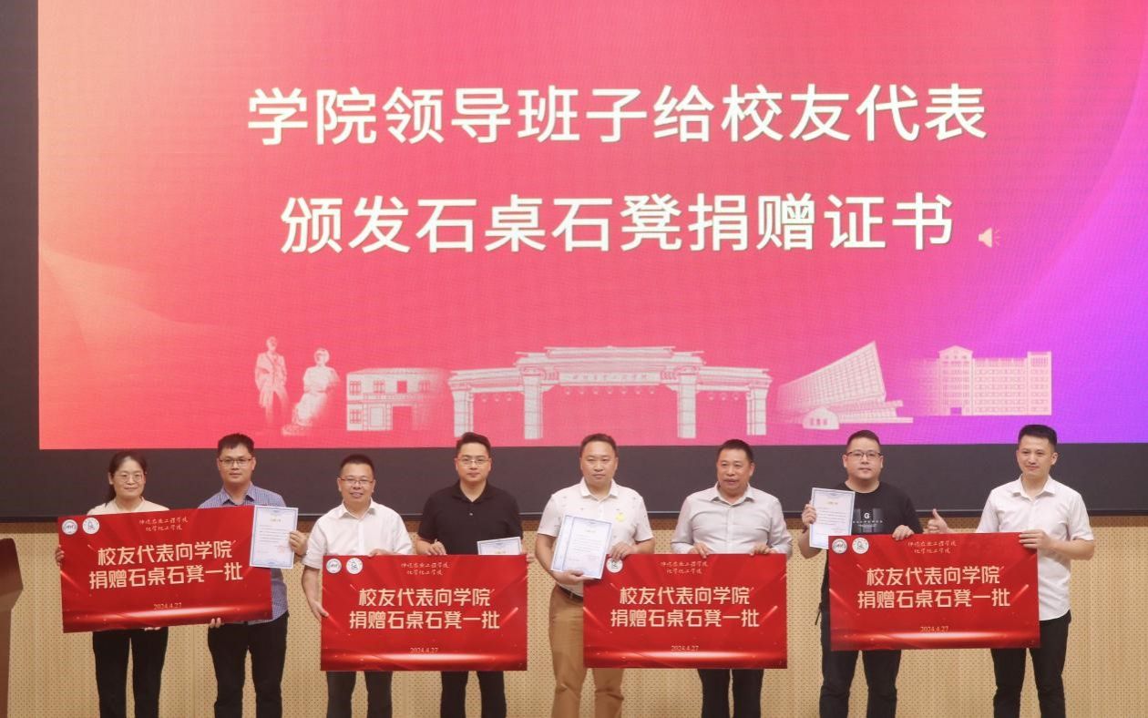 为感谢各位校友为学院新驻大楼添砖加瓦,学院领导班子为捐赠石桌石凳的赖建宏、莫嘉昕、骆志安、周晓武、蓝立财等校友代表颁发捐赠证书。