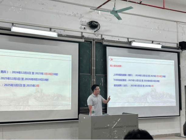 会上,袁海儒首先向与会学生传达了国家关于大学生征兵的相关政策,强调了大学生参军入伍的重要意义。同时还详细介绍了征兵流程、报名条件、优惠政策等内容,帮助同学们全面了解征兵政策。