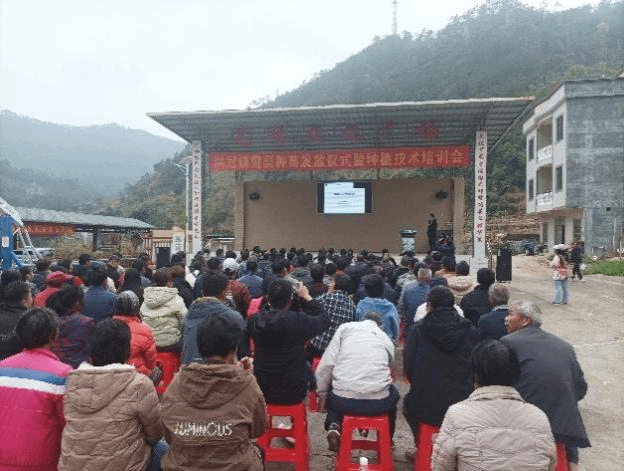 随后,农村科技特派员团队参加了洪冠镇在垌头村举办的雪梨苗发放和技术培训会活动。现场人头攒动,种植户们满怀期待等待专家授课和雪梨苗发放。彭程博士为全镇14个村150多名种植户进行雪梨种植建园规划、苗木移栽、修剪拉枝、疏花疏果等技术的培训和授课。授课后,特派员团队赴洪冠镇雪梨产业标准化种植示范基地,实地查看并现场指导,演示拉枝、修剪等操作,科学提升雪梨产量和质量,增强了种植户的信心。